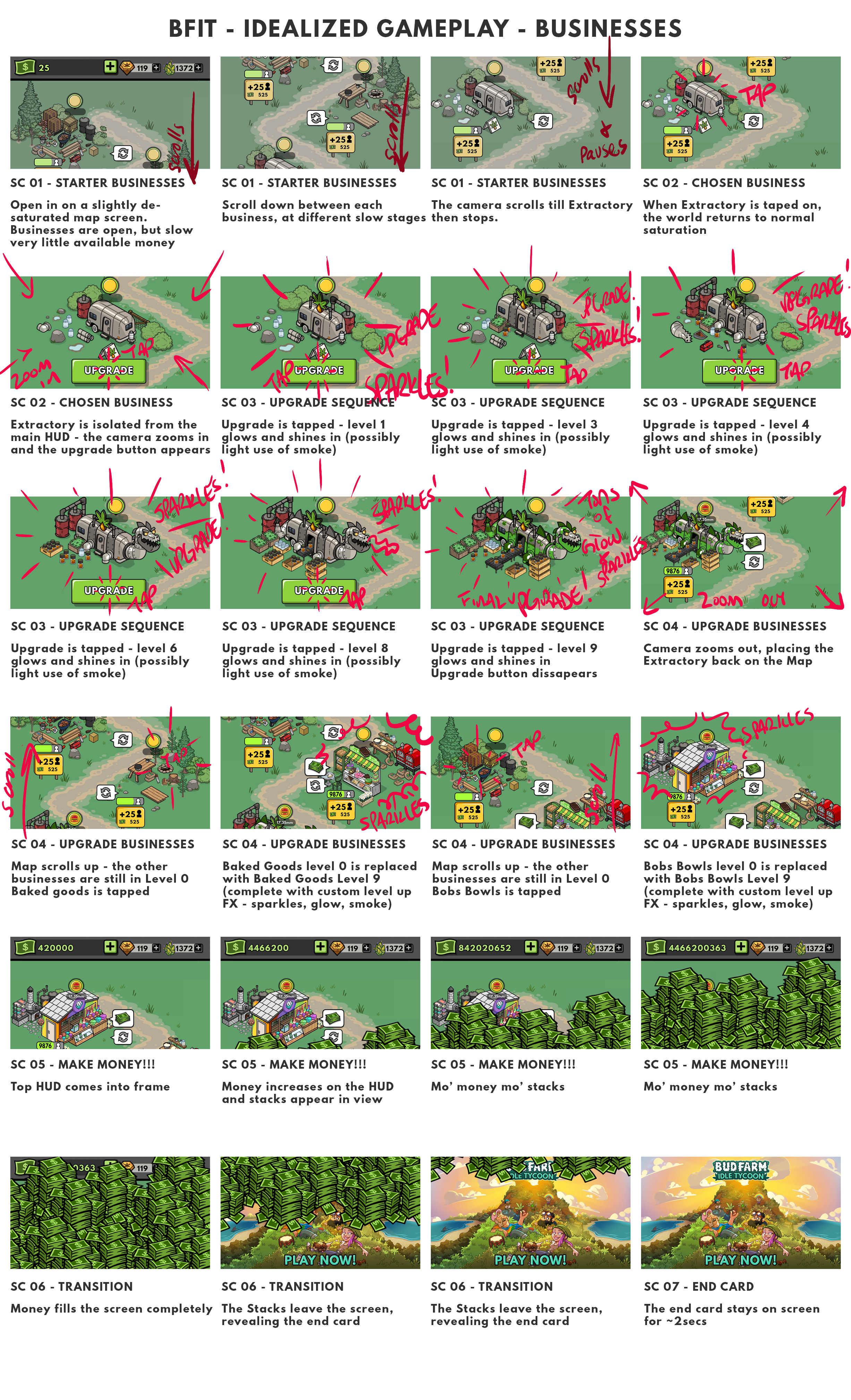 The creation of “Upgrading Businesses” was, at the time, a leap of faith. As testing was our focus, we did not spend too much time in the creation process. I was asking the Marketing Team to give me two weeks to put together a higher-fidelity ad than we’d used before; and one that featured a single aspect of our game. First step, was to give them the testing strategy and a series of ads I’d researched that fell under the “Motivation Model” umbrella. Using those ads as a template, I created the Upgrading Businesses Storyboard. The team, excited, gave the green-light and the risk paid off!
